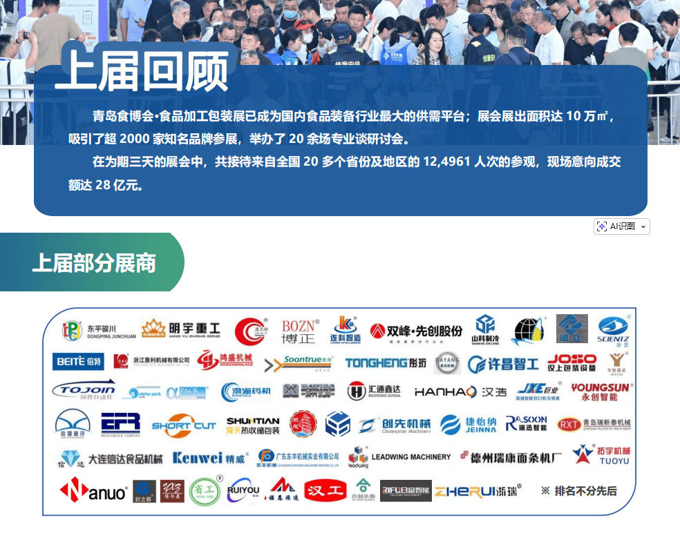 • “鲁食智制”从题馆:集中展现山东本土立异配备,如海产物智能分选线种海洋生物)、智能煎饼鏊子出产线%)。• 国际食材供应链展区:汇聚40个国度原料供应商取800+国内食物企业,建立全球供需曲通车,预制菜设备专区吸引200+新锐企业。• 20+场行业峰会:聚焦无人工场、低碳包拆、食物工业4。0,切磋绿色节能手艺(如热能收受接管、环保制冷)取数字化转型径。